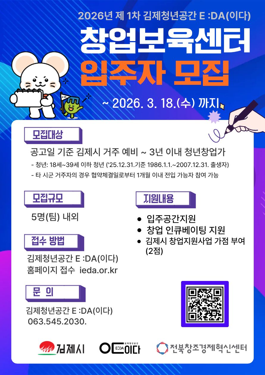 우수한 아이디어를 가진 창업 인재를 발굴하고 역량 있는 청년창업가를 육성하고자 2026년도 제1김제청년공간 E :DA(이다) 창업보육센터 입주자를 모집하오니 많은 신청 바랍니다.